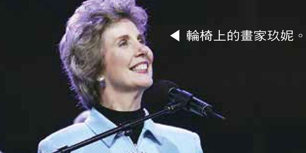 「輪椅上的畫家」玖妮(Joni)因為一場意外而終身癱瘓。她是「玖妮之友國際殘障支持團體」的創辦人與執行長,其以自身故事寫成的暢銷書《輪椅上的畫家》曾拍成電影,她的生命故事持續不斷影響全世界許多深受病痛纏身而受苦的人。