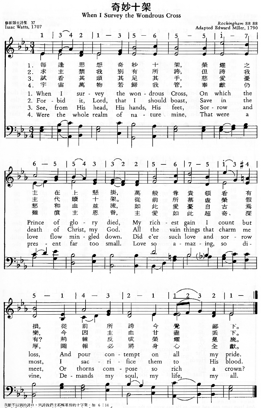 接著我們再來看華茲的另一首代表作《奇妙十架》,(也有譯成“每思想奇妙十架”) (When I Survey the Wondrous Cross )。