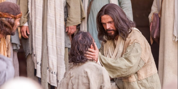 27 But Jesus took him by the hand and lifted him to his feet, and he stood up.
