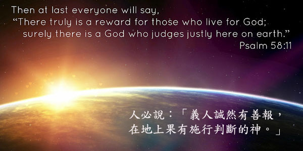 義人,也就是倚靠神的人,必然見仇敵遭報,要在惡人的血中洗腳。那時人必說:“義人誠然有善報,在地上果有施行判斷的神”。神說祂必為我們伸冤,伸冤在神,所以不要為了惡人短暫的囂張而不平,讓我們一起見證:“義人誠然有善報,在地上果有施行判斷的神”。