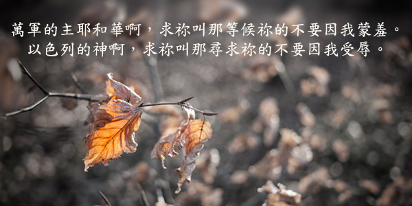 6 万军的主耶和华啊,求祢叫那等候祢的不要因我蒙羞。以色列的神啊,求祢叫那寻求祢的不要因我受辱。